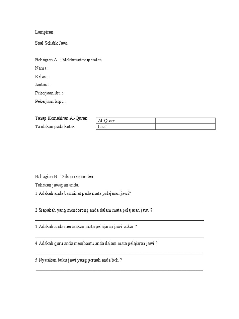 Pelajar selalu melakukan kerja lain semasa guru sedang mengajar Pendidikan Islam. Kaedah yang betul dalam proses pengajaran dan pembelajaran mempunyai faktor yang tinggi kepada keberkesanan PdPc dalam kelas dan sekaligus mampu menarik minat pelajar dalam menguasai matapelajaran Jawi Kamarul Azmi Abdul Halim 2014. Berdasarkan semua instrumen yang dibuat sikap responden terhadap mata Pelajaran Jawi dapat dikesan.