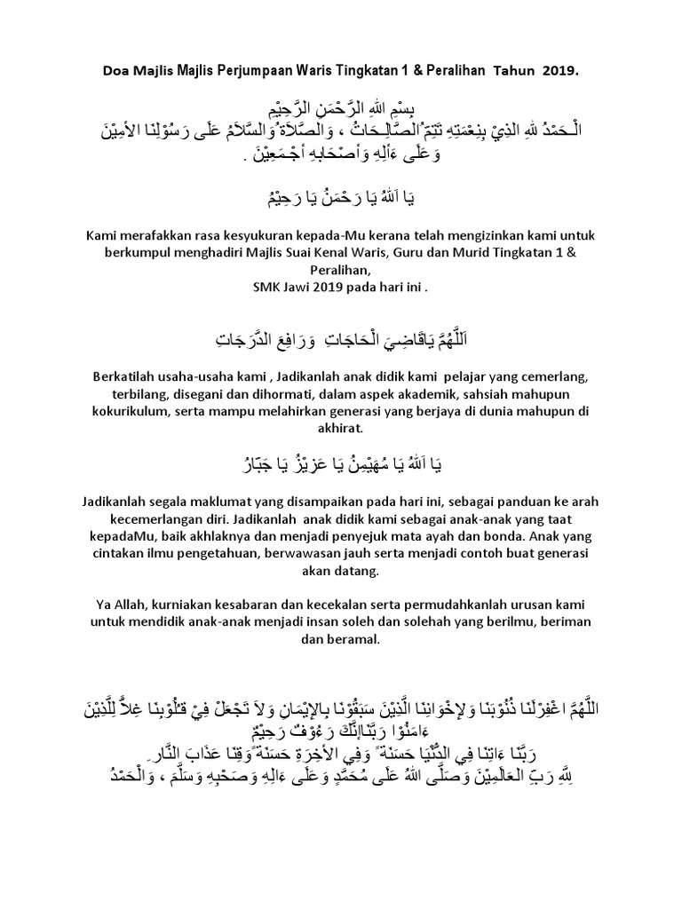 Doa Majlis Suaikenal Waris Guru Murid Tingkatan 1 2019 Pdf