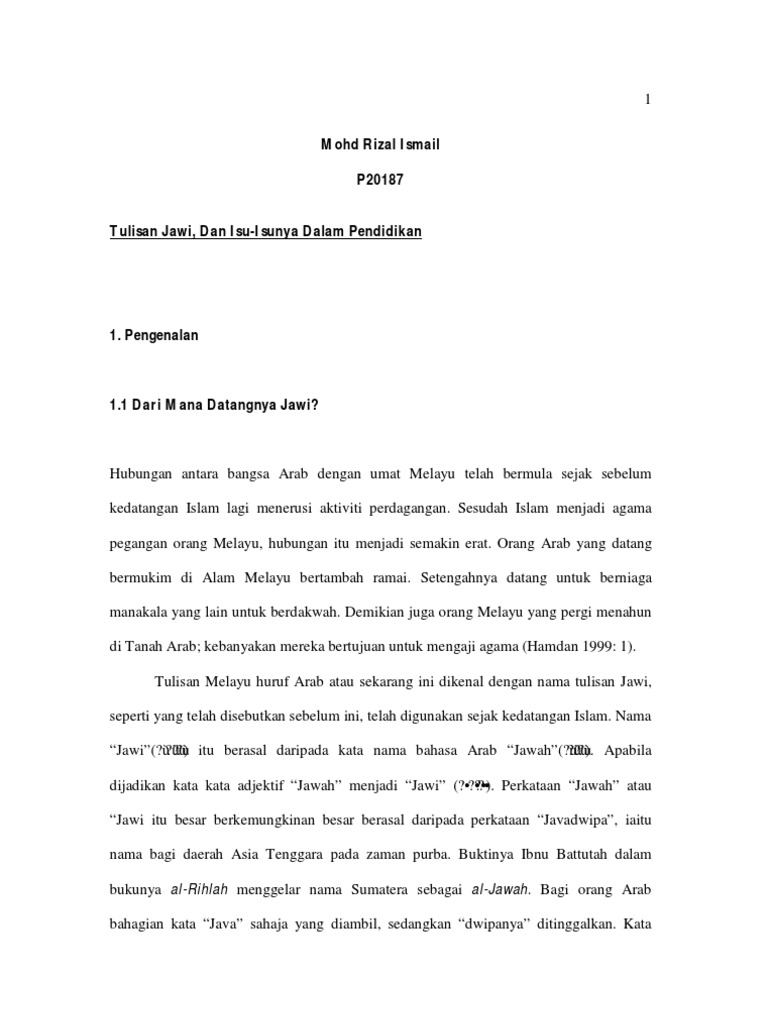 Tulisan jawi merupakan tulisan bangsa Melayu yang sebenar ramai antara kita terutama yang belajar di sekolah agama mungkin memang pandai menulis dan membaca tulisan jawi. Tulisan Jawi berasal dari tulisan Arab dan merupakan huruf-huruf Arab yang dimasukkan ke dalam sistem penulisan bahasa Melayu. Antara bukti tulisan jawi digunakan secara meluas di nusantara ialah penemuan surat-surat perjanjian jual beli yang ditulis dalam tulisan jawi penemuan batu-batu bersurat yang dijumpai di Kedah dan Terengganu Kanun Undang-Undang Negeri seperti Hukum 44 di Kedah Majallah Ahkam di Johor dan Hukum Kanun Melaka yang dipraktikkan di Melaka.